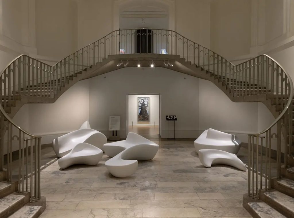 Vancouver-based artist Marie Khouri fled Beirut with her family in the 1970s during the Lebanese Civil War. The artist’s reverence for Arabic informs her interest in utilising language to explore new connections in art. In this exhibition, Khouri’s close integration of form and function follows the human body to produce sculptural furniture that cradles visitors as they recline. Each piece is formed through an extensive hands-on process that begins with clay moulded by Khouri that is then scaled up and remade with expanded polystyrene. The works then undergo vigorous carving and sanding, and as the flowing forms take shape, so do the Arabic letters and message of the artist: I Love.